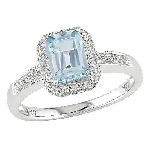 This gorgeous ring features an Emerald Cut Sky Blue Topaz (7x5) totaling 1 1/5 ctw elegantly set in 10K White Gold and adorned with 26 Diamonds (H-I, I1-I2) totaling 1/8 ctw.