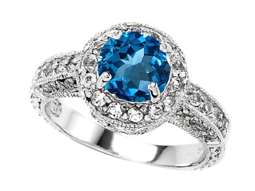 925 Sterling Silver 14K White Gold Plated Genuine Round Blue Topaz Engagement Ring crafted in 14k White Gold Plated Silver 1 Stone 1.35 Carats 7mm round Color: Medium to Light Blue Clarity: Clean, 48 Stones 0.75 Carats round white topaz Color: Colorless Clarity: Clean Metal weight may vary with finger size and metal choice. Finejewelers Style Number: 27149.