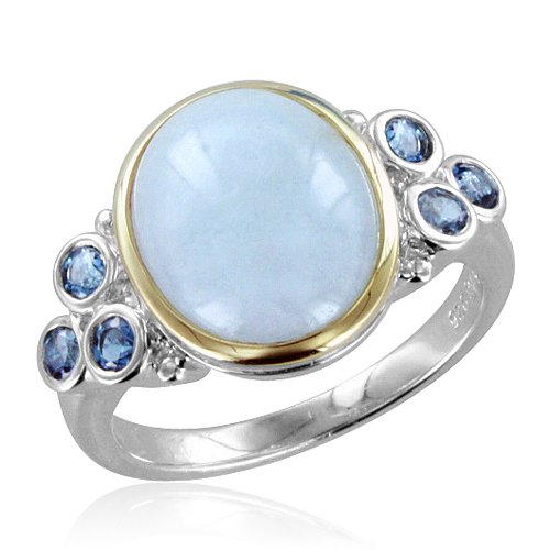 This gorgeous blue topaz and milky aquamarine ring is beautifully crafted in Sterling Silver with a 12 x 10 mm oval shaped cabochon milky aquamarine as the center gem stone and each side with three bezel set London blue topaz to add vivid color to this beautiful blue ring. Aquamarine is the March birthstone and blue topaz is the December birthstone. Birthstone jewelry is great jewelry gift for birthday, wedding, anniversary, or any holiday occasion. Add this elegant aquamarine and blue topaz ring to your jewelry wardrobe today! The widest part of this ring band is 2.5mm. Ring size 7 and 8 are available. It can be re-sized (from ring size 5.5 to 9). Please contact us for free ring sizing service.