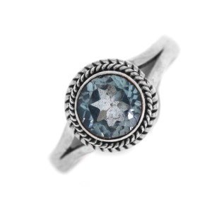 Beautiful crystal clear blue topaz stone simply sparkles! Stone is 6mm diameter with star faceting and is set in a .925 sterling silver rope fram with split band. Silver Peace (TM) - Artisan made, fair trade, and guaranteed for life!