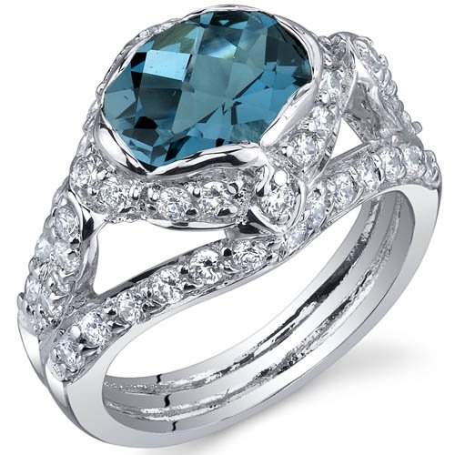 Center Stone: Genuine London Blue Topaz, Oval Shape with Checker Board Top, 9 x 7 mm, 2.00 carats, Caribbean Blue Hue with Brilliant Sparkle. Side Stones: 50 pieces Super Sparkling Machine Cut White Cubic Zirconia. Ring: 4.10 grams, Pure Sterling Silver with .925 stamp, Ring features exceptional Design, Craftsmanship and Rhodium finishing. Perfect gift for Mothers Day, birthdays, Valentines Day, Graduation, Christmas or just about any other occasion. Money Back Guarantee. Includes a Signature Gift Box & Free SHIPPING, style SR10064