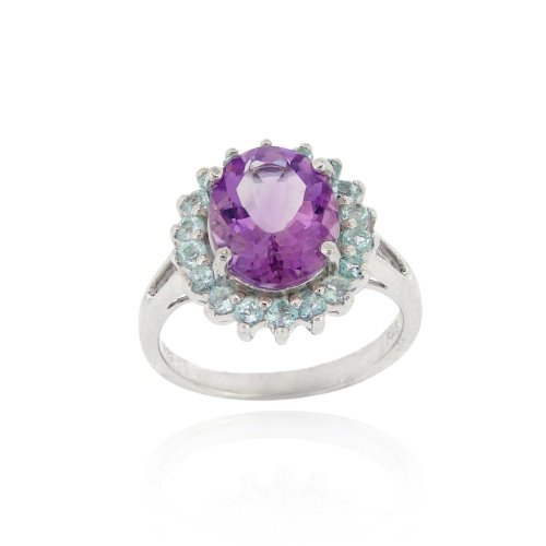 Sterling silver cocktail ring features a 8x10mm genuine amethyst stone surrounded by 18 round genuine blue topaz stones. The sparkly ring is the perfect accessory to liven up any wardrobe.