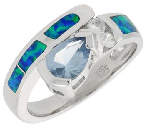 Cheap Sterling Silver, Synthetic Opal Inlay Ring, w/ Pear Shape Blue Topaz CZ, 3/8" (10 mm) wide, size 8 Review