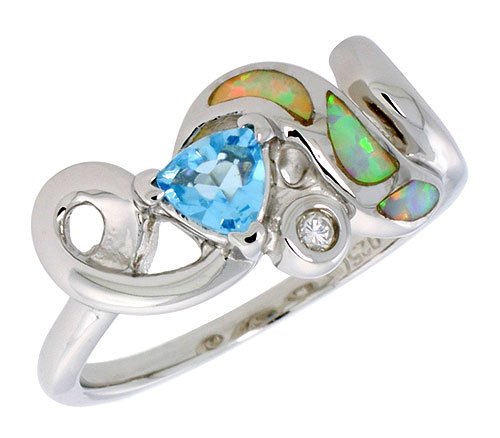 Cheap Sterling Silver, Synthetic Pink Opal Swirl Ring, w/ Trillion Cut Blue Topaz CZ & Brilliant Cut CZ Stone, 7/16" (11 mm) wide, size 7 Review