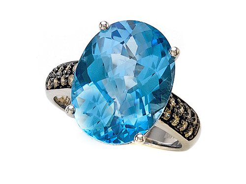 Genuine Blue Topaz Ring by Effy Collection® crafted in 14 kt White Gold Dimensions: Height: 8.00 mm Width: 12.00 mm Length: 16.00 mm1 Stone 10.64 Carats Blue Topaz Color: Blue Clarity: Eye Clean, 16 Stones 0.24 Carats Round Diamonds Color: Brown Clarity: SI Free 18 inches Yellow Gold Wheat Chain included Metal weight may vary with finger size and metal choice. FREE LIFETIME WARRANTY, GIFT BAG AND GIFT CARD! Finejewelers Style Number: 520175.