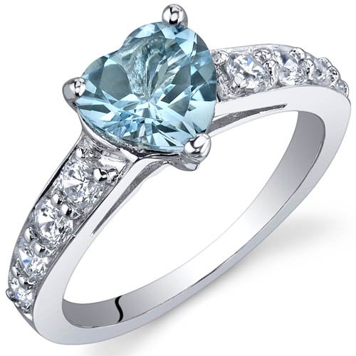 Center Stone: Genuine Swiss Blue Topaz, Heart Shape, 7 mm, 1.50 carats, Lagoon Blue Hue with Brilliant Sparkle. Side Stones: 8 pieces Super Sparkling Machine Cut White Cubic Zirconia. Ring: 2.50 grams, Pure Sterling Silver with .925 stamp, Ring features exceptional Design, Craftsmanship and Rhodium finishing. Perfect gift for Mothers Day, birthdays, Valentines Day, Graduation, Christmas or just about any other occasion. Money Back Guarantee. Includes a Signature Gift Box & Free SHIPPING, style SR9816