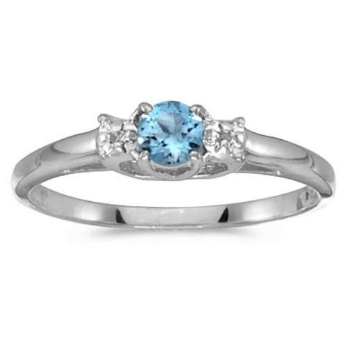 This 14k white gold December birthstone round blue topaz and diamond ring features a 4 mm genuine natural blue topaz with a 0.30 ct. colored stone weight and a single 0.01 cttw. diamond accent. Birthstone jewelry always makes a perfect gift. Combine our December blue topaz birthstone rings with matching earrings and a pendant for a pretty matching set. All ladies birthstone rings are available in one size, which varies between size 6 and 7. Men's birthstone rings are available in a size 10. Get a great look for a small price with these birthstone jewelry pieces made in the USA..