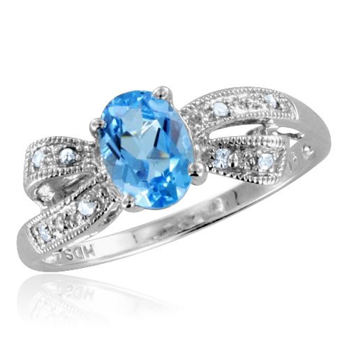 This beautiful bowtie motif blue topaz and diamond ring is beautifully crafted in lustrous 10k white gold. The center stone is a 7 x 5 mm oval shape Swiss blue topaz with diamond accented. Blue Topaz is the birthstone of December. Birthstone jewelry is one of the most popular personalized jewelry, which is perfect gift for anniversary or birthday.